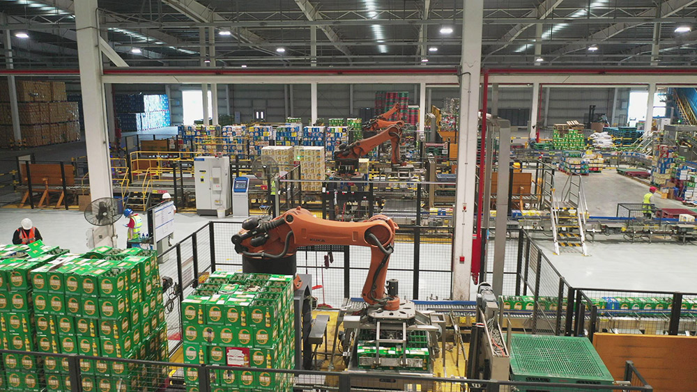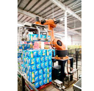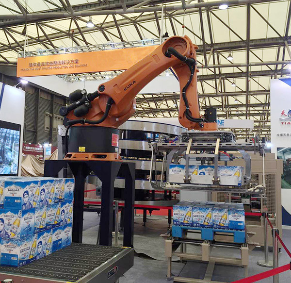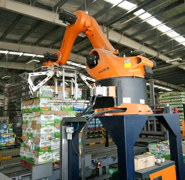 机械手卸垛采用德国库卡伺服运动控制系统和输垛定位及分箱输送构成,操作简单方便,低能耗等优点在自动化生产线得到广泛使用。