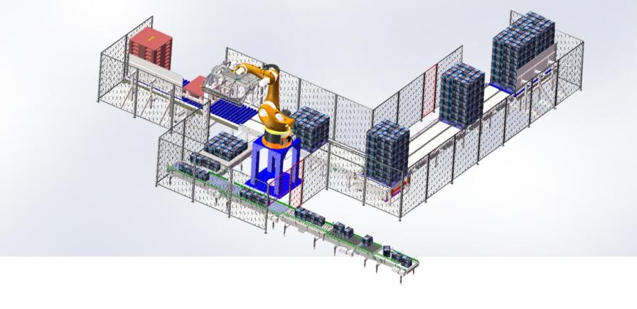 自动纸箱瓶卸垛机包括:垛板输送带、垛板仓、机械手及夹具、卸垛平台、储箱平台、分箱平台、理箱输送、提速输送、转向输送、安全防护装置、 整线控制系统。